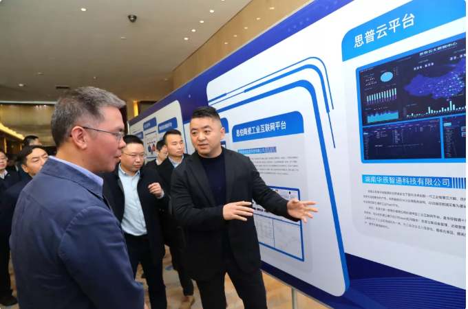 • Ebpay智通总经理傅帝向湖南省工业和信息化厅党组书记、厅长曹慧泉介绍思普云在工业领域应用情况